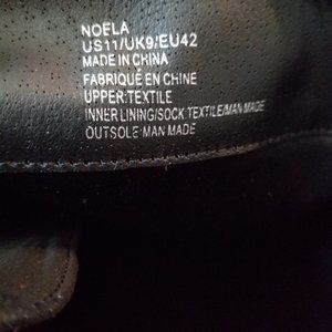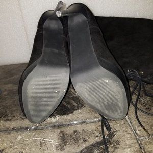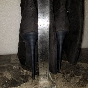 Sexy boots with inside zipper and adjustable laces for the perfect fit. These have a heel that is between 6 and 6.5 inches that looks like a stacked heel and about a 1.5 inch platform. They do have a little more of a higher heel feel due to the lower platform height. They are in excellent condition with the only sign of wear on the soles. The material has a velvet look to it and would go with almost anything. These are not likely the boots for a long evening walk but they are the boots to attract significant attention. Wear these to your Christmas party.