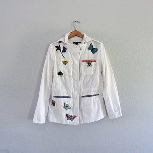 Boston Proper elegant ladies hooded jacket. Full zip front and snap closure, long sleeves, hood hidden inside the collar, pockets, internal drawstring/toggle waist. White with embroidery and 3D embellishing/pins; butterflies, bee, rose, flowers. Polka dot partial lining.