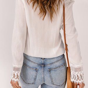 V Neck Front lace applique Dainty crochet sleeve trim Tassel accent 95% Cotton 5% Elastane Measurements included in images Dainty NYC offers women's fashion clothing clothes dresses tops shirts blouses jackets coats jumpers rompers jumpsuits loungewear hoodies cardigans pants jeans skirts trousers leggings shorts sportswear nightwear swimwear lingerie shirt lace bodycon faux fur shoes sandals slippers boots jewelry bags breathable lightweight fabric soft comfy casual cotton knit boho chic classy glam trendy romantic winter spring summer fall autumn 80's 90's silver rose gold *Letter size listed on garment Dainty NYC offers a variety of women’s tops and blouses including basic T-shirt, Graphic Tee, Fitted Cami, Sleeveless Shirt, Bubble Sleeve Blouse, Tunic, V-neck Top, Off the shoulder Top, Turtleneck Top, Peplum Top, High-Low Top, Plaid Flannel Top, Ruffle Collar Top, Button Down Shirt, Wrap Top, Sweatshirt, Sweater, Long Sleeve Henley, Boxy Top, Statement Top, Crop Top, Workout Top, Bodysuit, Floral, Solid, Pattern, Paisley, Tie-dye, Boho, Bohemian, Gypsy, Lace, Fitted, Wrap, Satin, Sequin, Winter, Spring, Summer, Fall