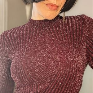 The dress is a lovely shade of plum or merlot, and has an interesting angle design woven into the fabric. The sparkle in the fabric is not sequined.