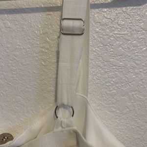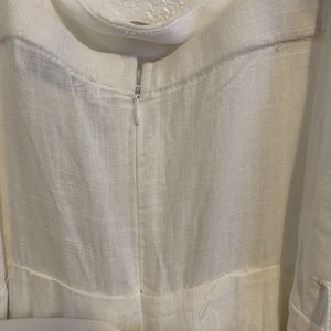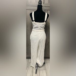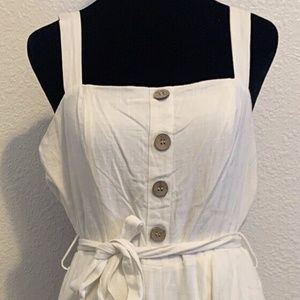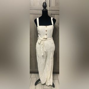 This beautiful playful romper or jumpsuit is part of the Lilyful collection. It is an all white cotton blend with a back zipper closure and large tan buttons to accent. The hemline is an ankle length and the legs are a wide fit. It has about a 21" inseam, a tie around the waist and wide adjustable shoulder straps. Jumpsuit has been professionally cleaned. Piece is free of rips, holes, tears & stains. It has been in storage in a non-smoking home. If you have any questions please message me. PLEASE REVIEW PICTURES.
