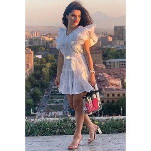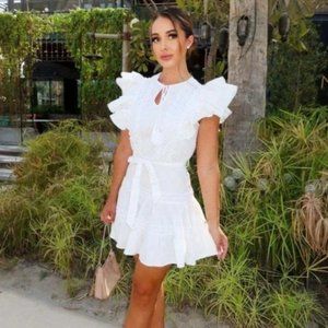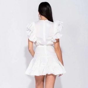 White Lace Trim Short Frill Sleeve V-Neck Tiered Mini Dress