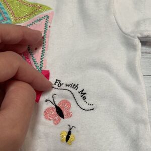 Adorable girly onesie in very gently used condition. Has floral, glitter, and ribbon detail.