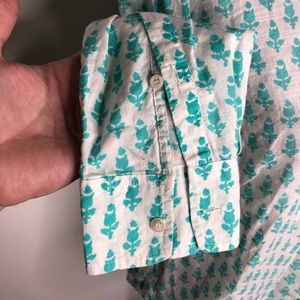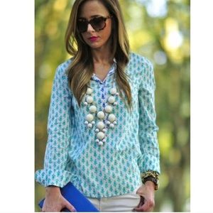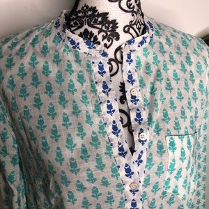 This tunic is 100% cotton. It is an Aqua color print with dark blue contrast print at the collar an down chest. 1/2 length button closure. Minor washer wear