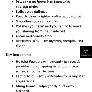 appearance. Mung Beans: Helps gently buff away dull skin. Oats: Gentle exfoliator for a smooth complexion. NEW/UNUSED/FULL SIZE/NEVER SWATCHED. MSRP; $32 price FIRM unless bundling. 🌸