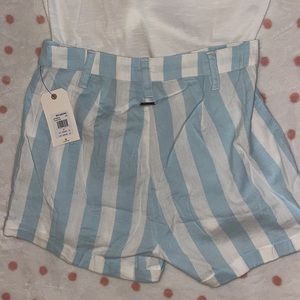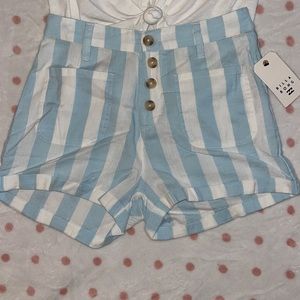 Style: normal tee shirt with tie knot in the front (can be undone) and high waisted shorts with a zipper.