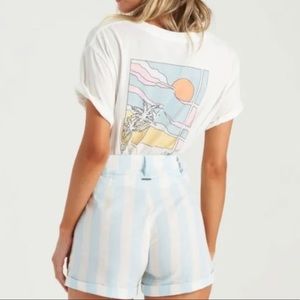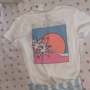 Color: shirt is white with billabong logo and sunset printed and shorts are striped blue and white