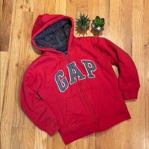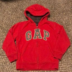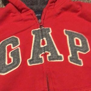 Red gap zip up sweater. Very thick, fuzzy on the inside. Gray letters. Very warm. Has 2 pockets