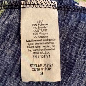 Summer days or summer nights this flexible faux wrap sundress is packable and comfy yet flattering. Navy floral, with tags. Front bodice is lined. Dress is 96% polyester and 4% spandex. Lining is 95% viscose and 5%spandex.