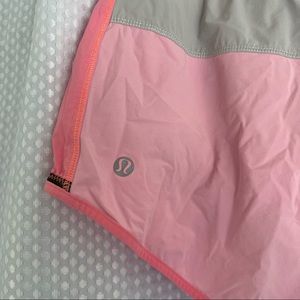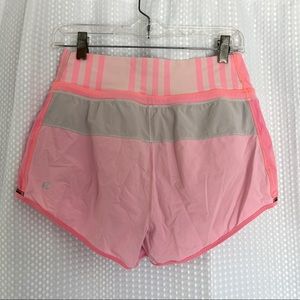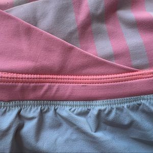 Lululemon athletic shorts with a crossover waistband. Size 4. Stripes. In great condition! Has a small mark on the waist, looks like maybe a pen mark (pictured).