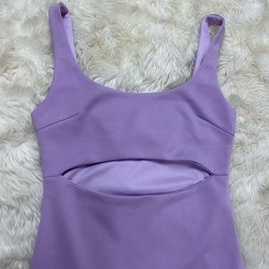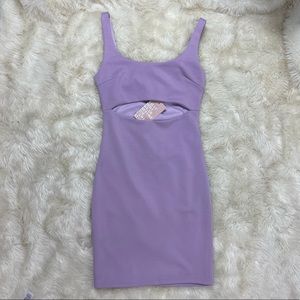 New with original tags light lilac purple Coco bodycon dress with a sexy cutout under bust and a second interior skirt layer underneath. Made of a relatively stretchy polyester/elastane blend. Tiger Mist brand size xs