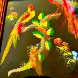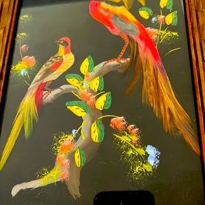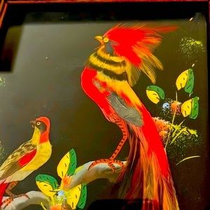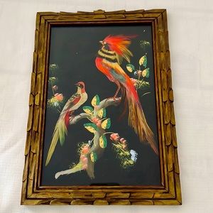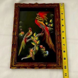 Vintage ~1950’s / Feather~Symbolizes High Honor, Trust, Strength, Wisdom, Power and Freedom / Important artistic and decorative technique pre~Hispanic and colonial periods which is now Mexico, also called “Plumaria~Plumeria”. The feather is a powerful symbol signifies honor a connection between the owner, the Creator, and bird which the feather came. Picture has wooden frame and glass front with a loop for hanging.