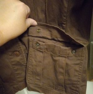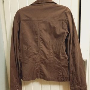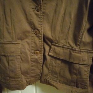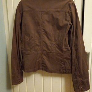 Dusky brown jacket with collar--so cozy and versatile. The fabric has a deliberate distressed look, and is accented with vertical stitch detailing. Blazer has 2 front flap pockets, both with snap closures, and sleeves with 2-button cuffs. Fabric has a bit of stretch, so the jacket doesn't feel at all confining--it moves with you.