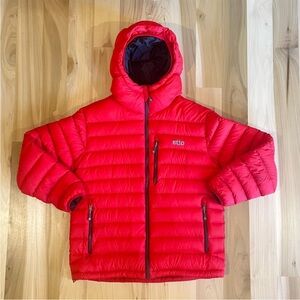Jackets can be separated by unzipping and unbuckling wrist snaps. Top jacket is water and wind proof. Hood and zipper pockets. Bottom layer is down with zipper pockets.. Meant for all outdoor activities - skiing/snowboarding, hiking, backpacking, camping, etc… puffer jacket below
