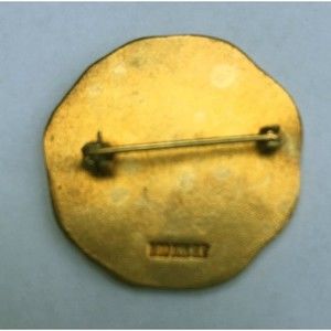 Approx. 1" in diameter, this lovely pin is brilliant with its aureate lettering backed by red enamel. It is 6g, 1/10 10 karat GF.