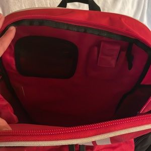 EUC! ADIDAS red backpack 🎒. Has a stain on the bottom white edging. See photos. Aside from the stain and the small tread pull, this bag is in amazing condition and has so much room.