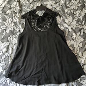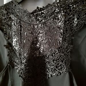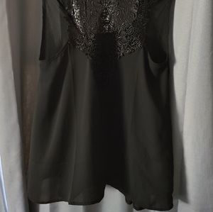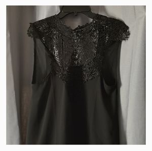 This top is very pretty. Beautiful black lace in the top portion and long ties in the back at the neck. Lightly sheer. I removed the tags before I tried it on as they showed thru the pretty lace and then it didn't fit. I don't remember the maker but it is a size small. Machine wash hang dry. In like new condition.