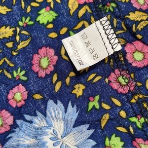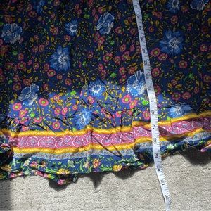 gently preowned long blue flower & paisley print patterned skirt with subtle tiers. elastic waistband with drawstring. size medium & runs small imo but please see photos for approximate measurements | yellow pink white green