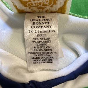 Adorable babies bathing suit with ducks and cattails print. Has a blue and white collar with bow like detail, four buttons four buttons on waist (two in front two in back).