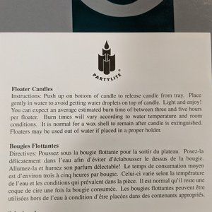 New in Box! Rare! Retired! PartyLite Floater Candles F1000 Lemon & Kiwi ,Yellow & Green Flowers. Never used, never displayed. Original owner. Candles can be used as floaters or out of water if placed in a proper holder. Information card included, which indicates "You can expect an average estimated burn time of between three and five hours per floater. Burn times will vary according to water temperature and room conditions." Please see all pictures, which are of actual item. Pet free, smoke free household, thanks for looking!