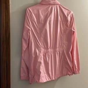 Talbots pink windbreaker with hidden hood and fitted waist.