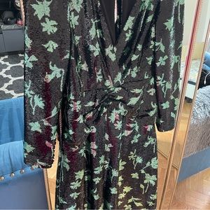 Beautiful dress for a black tie event or night out, party etc. green and black sequins with palm tree print. Size 10.