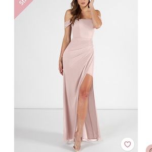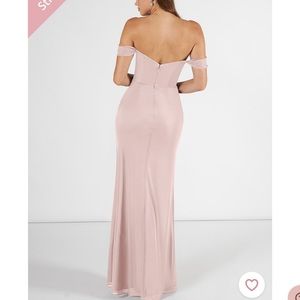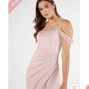 Dress your friends in style for your big day in our mesh dress, Kit. Her off-the-shoulder neckline has delicate pleated sleeves. Her mermaid skirt features beautiful pleating that hides a front side slit. We have added removable spaghetti straps to give you the option to feel more comfortable and secure throughout the day.