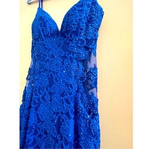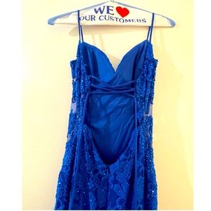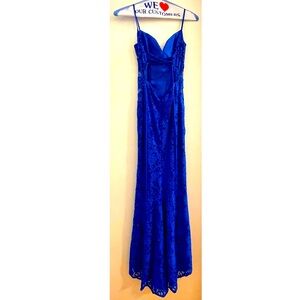 Royal blue lace dress styled with a fitted bodice, a strappy back and a gorgeous side split