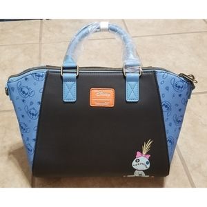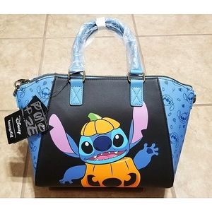 New with tags Loungefly Disney's Lilo & Stitch Pumpkin Halloween Satchel Bag. Measures about 11 inches W (bottom), 15 inches W (top), 9 inches H, 4.5 inches D. Top carry handles and adjustable strap for crossbody wear.