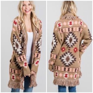 SOLD OUT Taupe Western Native Tribal Aztec Boho Fringe Knit Open Cardigan