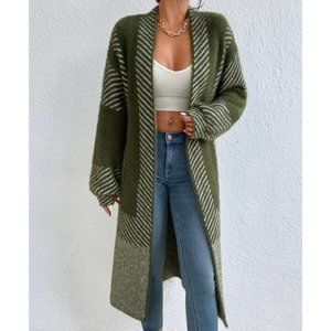 open front striped print fuzzy sweater knit duster cardigan green