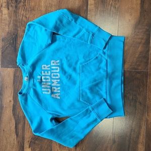 light blue Under Armour brand crew neck pullover sweat shirt. Has silver metallic under Armour on the front. In good condition. Size Small/P