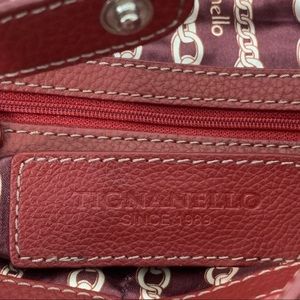 Beautiful, Great Condition Red Pebbled Soft Leather Tignanello Double Rolled Handle Handbag with Magnetic Closure. Snap Strap Inside Bag. Interior: 2 Slip Pockets, Zip Pocket and Center Snap Closure. Metal Feet. Hardware Logo. There is a very minor flaw, please see last pic.