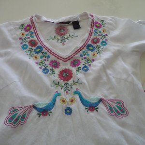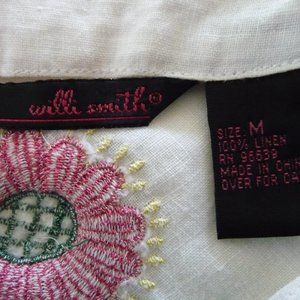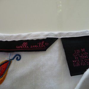 WILLI SMITH TRENDY BOHEMIAN HIPPIE PEASANT FESTIVAL WHITE LINEN BLOUSE WITH EMBROIDERY SIZE M