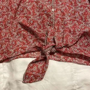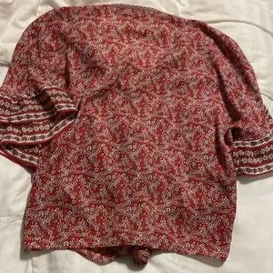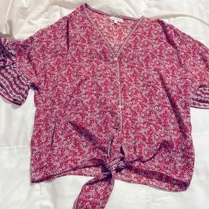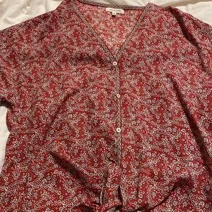 This blouse is in excellent condition and has no marks or signs of wear. It’s a half sleeve blouse that ties in the front. Made in China. 100% Polyester.