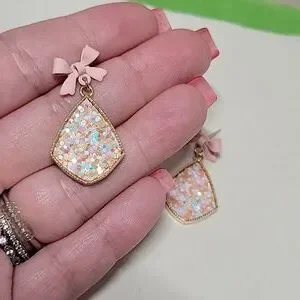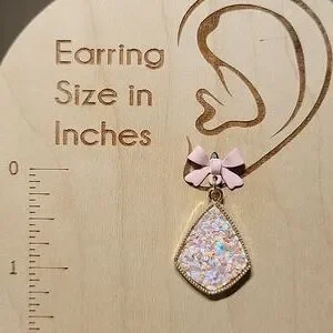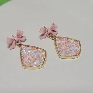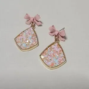 Lots of shimmery glitter from dangle earrings that drop from soft pink rubberized alloy bows!