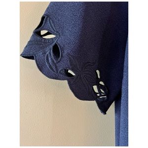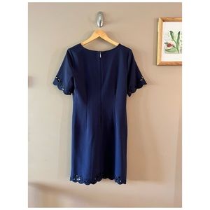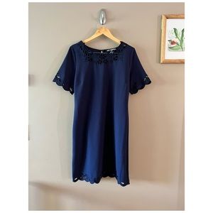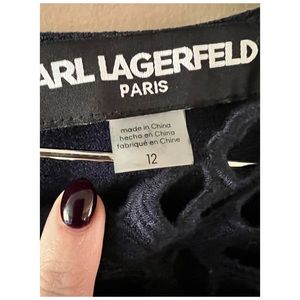 Karl Lagerfeld Paris Dress. Navy Blue with Floral Cutout Detail. Short Sleeve. Size 12. Excellent condition. There are a few very small snags in the fabric, but I couldn’t capture them in a picture because they are so small.