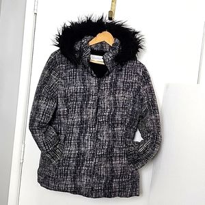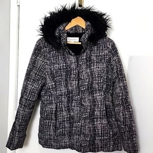 Calvin Klein Down Jacket Size M. Super warm jacket with 60% Duck 40% waterfowl feathers. Shell 100% polyester. Detachable hood with faux fur trim and draw strings. Side pockets with zipper, large inside pocket, and 1 small with snaps. For easy access to your phone or wallet, there is another zippered pocket outside the left sleeve. Measuring 21 inches armpit to armpit 27 inches long and sleeves are 24 inches long. Branded zipper and snaps. #downjacket #downfeathers #calvinklein #winterjacket #detachablehood