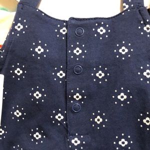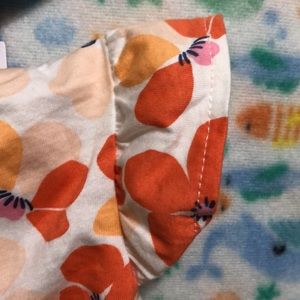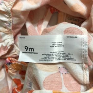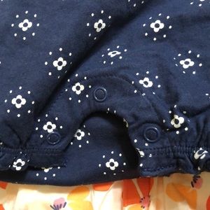 Size-9 mos, navy blue base with white polka dots & flower pattern sleeveless onesie with bottom snap closure, elastic ruffle leg trim, snap closure to back, dress & bloomers with white base, flower print with multi shades of orange, pink & purple color, keyhole with button closure to back, ruffle to arm openings. Very cute set!