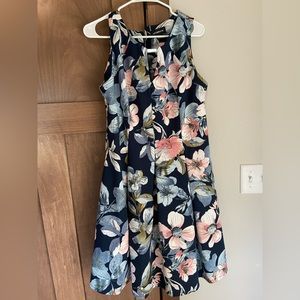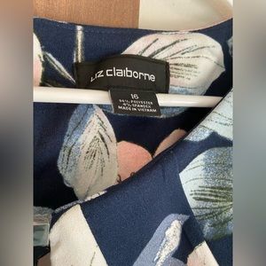 Size 16 Liz Claiborne sleeveless floral pleated fit and flare dress. It's navy blue with a stunning pink, blue, and green floral pattern as well as a cutout neckline detail. It's in great condition and makes the perfect spring/summer dress!