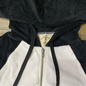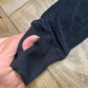 This is a really great zip-up terry cloth hoodie sweatshirt. The color is called cloud and onyx. The sleeves have runners thumb slits to help keep those hands warm. Super cute. Brand new. Women’s size small.