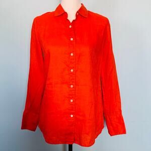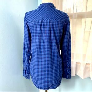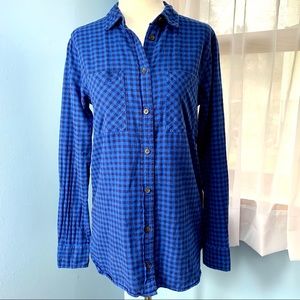 A fun blue flannel in gingham/mini buffalo check that is perfect for a cool day either alone or layered! Button down with front pockets in royal blue and a blue/black. Gently worn in very good condition!