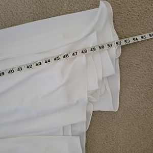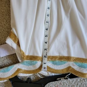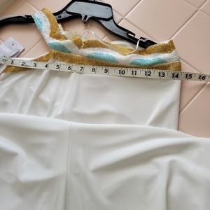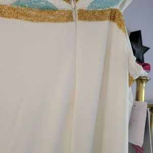 Measurements are approximate, as shown in photo no.2 there maybe a few loose beads but to the best of my knowledge there are no beads missing. Extra bag of beads included, just in case. New with tags ,never worn. As far as I can see no white material is perfect there may be shading but it may be so faint the photo does not show although i included a photo circled to show if this a flaw or just in the material. Material has stretch. dress has zipper in back ,also a slit up the back side. Take note: there is no RN tag inside. This dress is a one shoulder - strap,and the other is strapless.