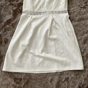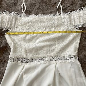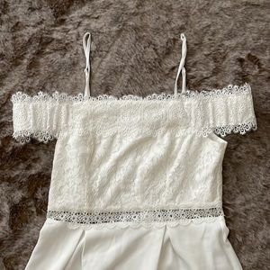 Francesca’s white lace bodice off-the-shoulder spaghetti strap mini dress. Lined bodice, peek-a-boo waist, solid white unlined skirt. Size small