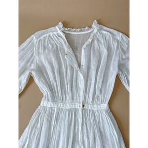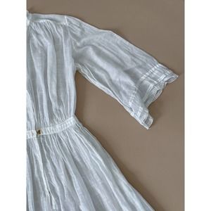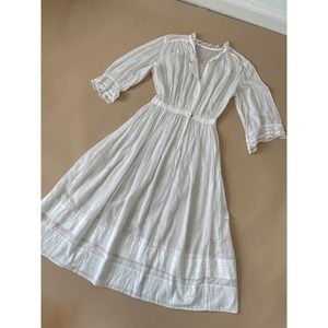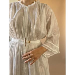 Antique Edwardian era white cotton dress with ruffle lace trim, a metal hook and eye closure, snap buttons along the front, in a pullover style. It is extremely light weight and semi sheer, the gathered cuff on one sleeve has been released a bit and there's some rust staining at the waist with small tears in the skirt (seen in photos).