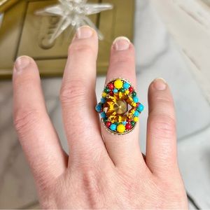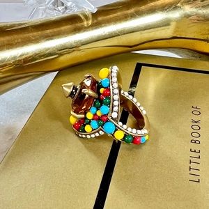 This ring has Gold Tone Metal, Faux multi-color beads, faux pearls, a large amber Swarovski crystal in the center with a spike on top. This ring is in excellent pre-owned condition & is a size 13. It will come with the authenticity card & care booklet. Please observe all photos.