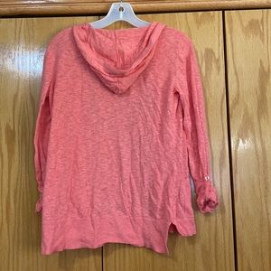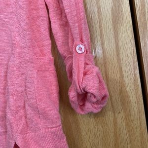 Light weight Maurice’s size large pink open front hooded cardigan with two front pockets and buttons to roll sleeves. Only worn a few times. Super cute layering piece.