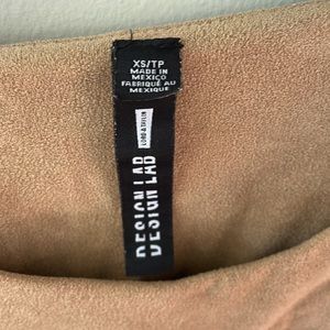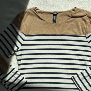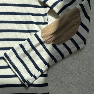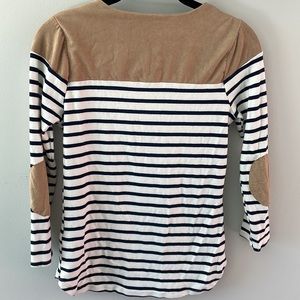 Blouse by DESIGN LAB by Lord & Taylor. Size is XS. 95% Cotton, 5% Spandex, White with Blue Stripes and brown Faux Leather on Top Shoulders and Elbow Patches. Scoop Neck Top, 3/4 Sleeve.