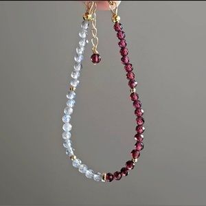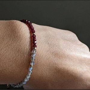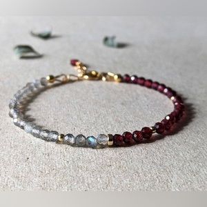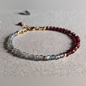 - This dainty bracelet features half misterious labradorite and half intense deep red garnet accompanied with 14 karat gold filled beads and other 14 karat gold filled settings. The beads are about 3.5 mm, a very light and elegant bracelet.