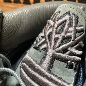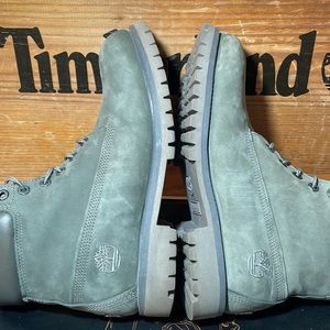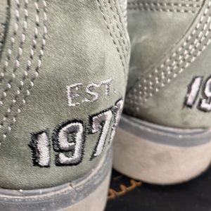 Timberland Premium Boots. University style branding accents. Nubuck leather. Exquisite raised embroidered branding/logo on tongue and back. Very good used condition. Color is grayish and greenish and sorta blueish too. Very unique, rarely seen color.